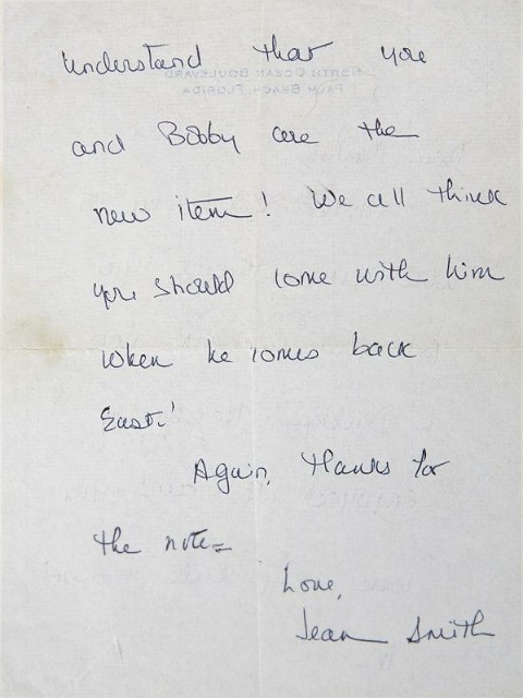 “A single sheet of stationery listing an address in Palm Beach, Florida, with autograph notation in blue ink on recto and version reading in full, ‘Dear Marilyn – Mother asked me to write and thank you for your sweet note to Daddy – He really enjoyed it and you were very cute to send it. Understand that you and Bobby are the new item! We all think you should come with him when he comes back east! Again thanks for the note. Love, Jean Smith.'”