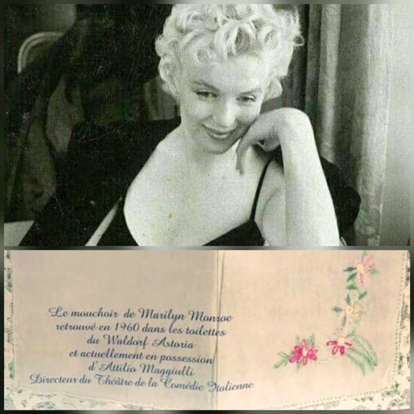 “A handkerchief belonging to Marilyn Monroe has single-handedly saved a historic Paris theatre from bankruptcy after its owner auctioned the legendary Hollywood actress’s ephemeral possession for €300,000 (£270,000). For decades, the silk kerchief with floral embroidery and bordered by ivory lace had pride of place in the baroque hall of the Comédie Italienne, France’s only theatre dedicated to Italian commedia dell’arte, in Paris’ Left-Bank 14th arrondissement. Its owner, Attilio Maggiulli, kept it as a lucky charm and the item even inspired a play two years ago called Le Mouchoir de Marilyn (Marilyn’s Handkerchief.)