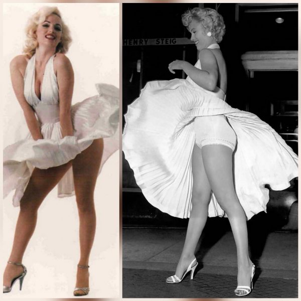 This aerial photo taken yesterday shows a giant artwork inspired by Marilyn’s ‘subway scene’ from The Seven Year Itch, created using different varieties of rice in a paddy in Shenyang in China’s northeastern Liaoning province (see here.) Unfortunately, the image used is not actually of Marilyn, but tribute artist Susan Griffiths – in the comparison below, you can see Marilyn’s hair was shorter.