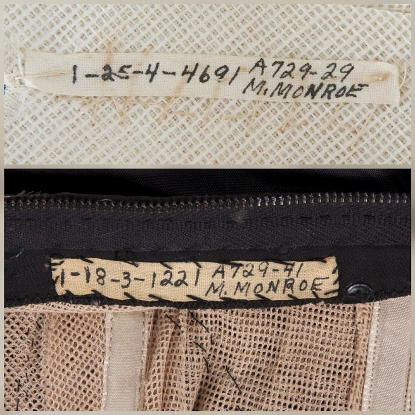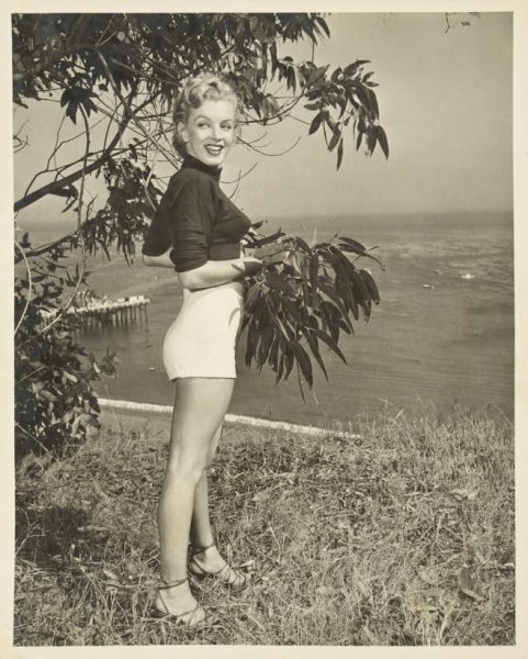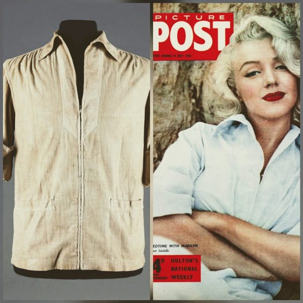 100 Marilyn-related items, including clothing, photos, letters, receipts, will go under the hammer on July 17 as part of a Hollywood: Legends and Explorers event (all on display at Julien’s Auctions in Beverly Hills from July 13.) Beginning a series of posts, today I’m looking at items related to Marilyn’s iconic personal style. First up is this tan corduroy shirt with cuffed short sleeves, worn by Marilyn during a 1953 photo shoot at Laurel Canyon with Milton Greene. Despite major discoloration, it’s estimated to sell for $10,000-$20,000.