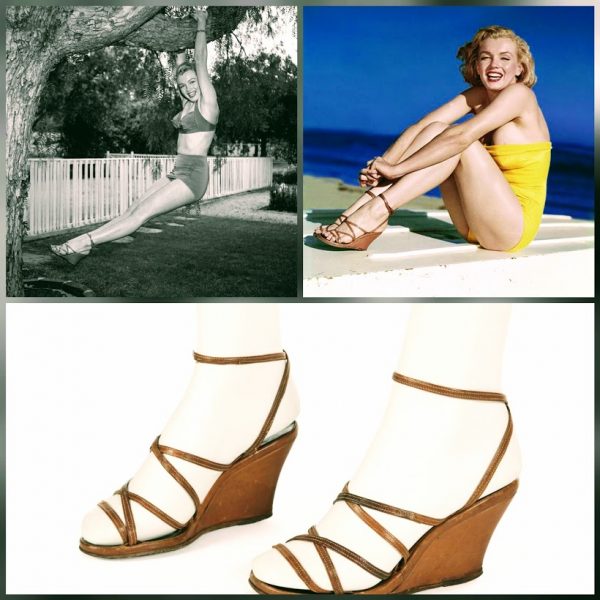 “A pair of wedge-heeled tan leather sandals with crisscrossing straps on the vamp up to the ankle, right shoe is stamped ‘by Catalano,’ appearing to be a modern day women’s size 6 with a 3 1/2 inch heel; in very well-used condition as Monroe wore these in countless photo shoots during her early modeling days in the 1940s and early 1950s. Estimate: $30,000 – $50,000″