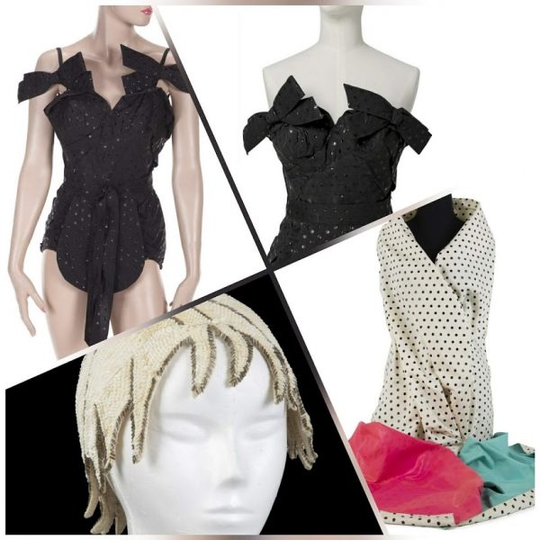 “20th Century Fox, 1954. A three-piece ensemble consisting of a bathing suit made of black silk with ‘applied’ black polka dots,in fragile condition now with areas of evident repair work; a coordinating large wrap, white cotton with the same ‘applied’ black polka dots as suit, trimmed in a wide panel of rose-colored cotton on one end and light blue cotton on the other; and a bathing cap with a petal-like hem adorned with white sequins and silver-colored bugle beads. Made for Monroe to wear There’s No Business Like Show Business and designed by Travilla, this outfit is quite similar to others the star wears throughout the film, though it is not seen in the final cut; however, it is evident it was made for the same production due to its style and construction.” Estimate: $8,000-$10,000