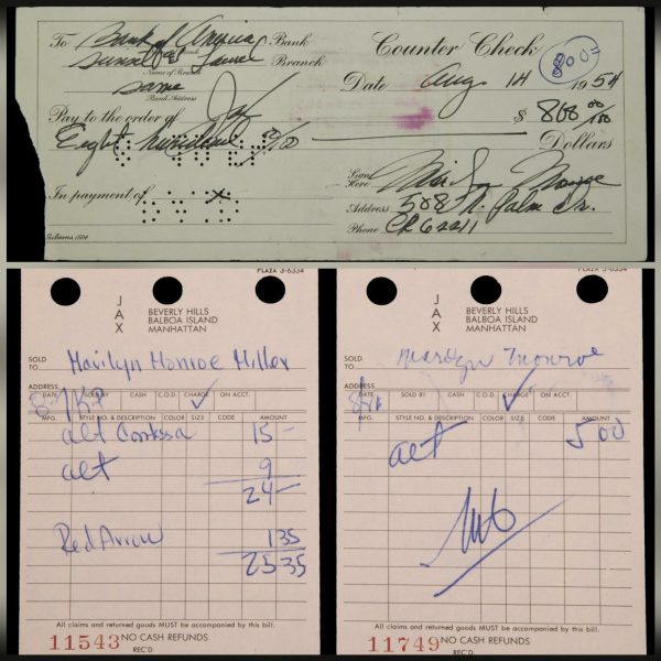 A black sleeveless knitted top with plunging V to front and back from the Los Angeles boutique Jax (Estimate: $3,000-$6,000); and sold separately, a 1954 cheque for $800, handwritten by Marilyn and paid to Jax (Estimate: $2,000-$3,000); and a pair of receipts from Jax, billed to Marilyn Monroe Miller (Estimate: $200-$300.)
