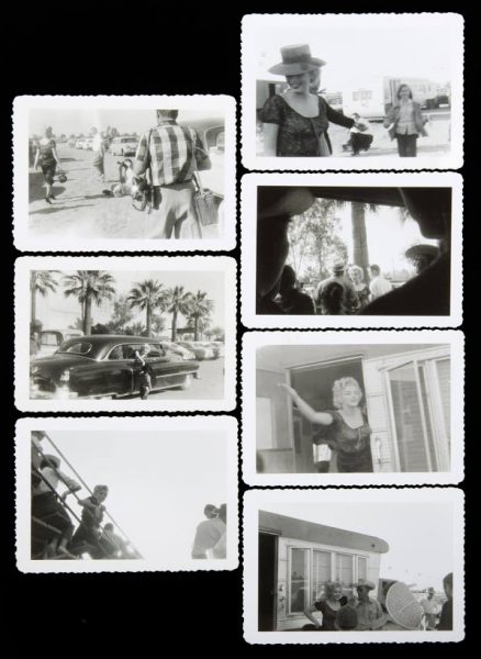 “A group of seven black and white original photographs of Marilyn on the set in Phoenix, Arizona, during the filming of Bus Stop (1956). Six of the images have handwritten annotations on verso, ‘MM sitting in stands waiting for filming to start’; ‘MM walking to stands to start working. Reminds me of her walk in Niagara’; ‘MM with rodeo official’; ‘MM talking to director Josh Logan’; ‘Boy shaking hands with MM. He was also at the airport when she arrived. She picked him up and held him. When she saw him again, she remembered him from the airport’; and ‘Filming finished, MM and Milton H. Greene walk to her car. That evening she left Phoenix for Calif.’ All images are likely never before seen, from the estate of Frieda Hull” (Estimate: $3,000-$5,000.)