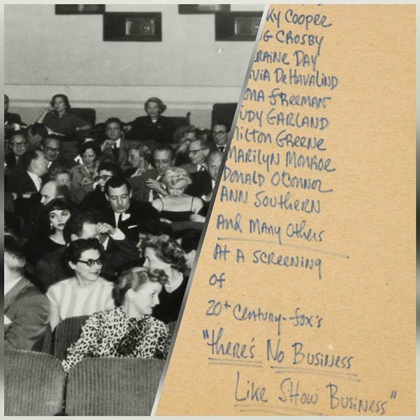 Marilyn at a studio preview for There’s No Business Like Show Business (1954), with a handwritten note on the reverse listing celebrities in attendance, though not all are visible (Estimate: $600-$800.)