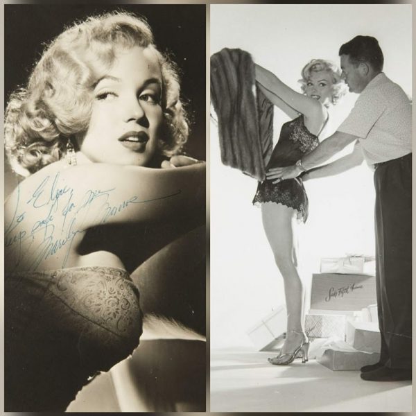 At left, another Willinger portrait signed by Marilyn, ‘To Eline, Keep safe for me’ (Estimate: $4,000-$6,000); and at right, Marilyn holds a fur stole while photographer John Florea ‘helps’ her to pose. A Saks Fifth Avenue box can be in the background (Estimate: $1,000-$2,000.)