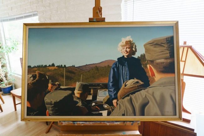 “Mills’ father, John Mills, who died in 1989, was a trumpet player in the Korean War and struggling musician before becoming an artist. In fact, there’s a large painting in Mills’ home of the time his father and fellow bandmates met Marilyn Monroe during a USO tour. He took a photo of her and later used that photo to paint her picture talking with the others in the band.