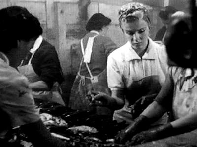 “The shift from the ambience of the censored thirties is most literal, in a different sense, in Clash By Night. Adapted from a [Clifford] Odets drama, its screenwriter was former Popular Front [aka the Hollywood Anti-Nazi League] lyricist Alfred Hayes, who had most recently worked in Rome scripting (albeit without credit) scenes of Paisan, the neorealist classic directed by Roberto Rossellini. Set in the considerably less romantic ruins of contemporary Monterey, California, Clash opens realistically with a proletarian scene of boats bringing back the catch for the fish-processing plant, then sweeps in to show a young Marilyn Monroe, rising sleepily and unwillingly from her lonely bed at the call of the alarm clock, then walking to the plant for her production-line job of fish sorting. Soon enough, we learn that the catch is down, part of a larger melancholy drift: Monterey’s happiest days as a working-class town are now well behind it, and the urgency to get out has become supreme.