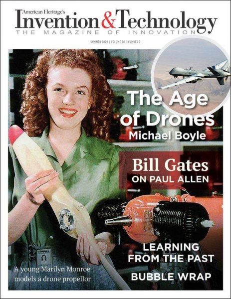 It may be a rather dubious legacy, but no history of drone technology is complete without that famous photo of a young Norma Jeane Dougherty on the Radioplane factory floor. She is now gracing the cover of the Summer 2020 issue of American Heritage’s Invention & Technology magazine (digital only), with Michael J. Boyle’s article, ‘The Age of the Drone,’ featured inside. (Although Marilyn would later credit her stardom to the support of US troops in Korea, in her final years she was firmly opposed to the use of nuclear weapons – see here.)