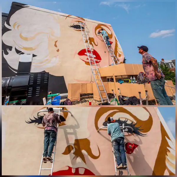 A few days later, Kevin declared the facelift complete. He and Andrew had brightened Marilyn’s face with bold colors and renewed her striking beauty mark. The actress’s mirrored eye highlights — dulled by the elements — had been replaced. A new pair of circular mirrors were epoxied in place. The formerly red-brick wall to the left of Marilyn’s face had been covered in black paint, making the mural pop even more.