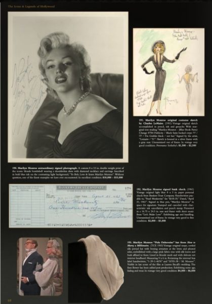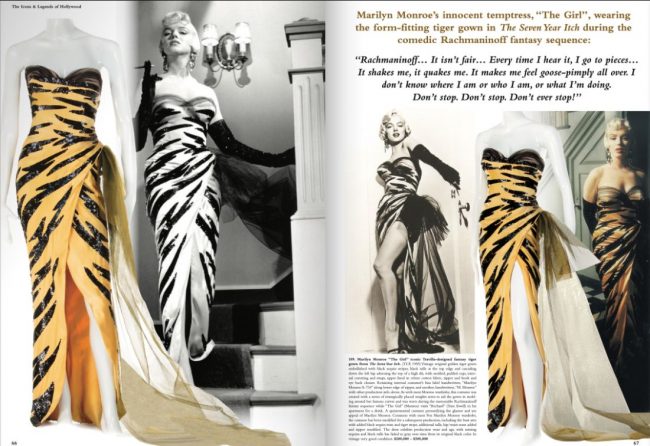 Other Marilyn-related items include a signed photo, and cheque; a costume sketch by Charles LeMaire; and a taupe silk hat worn by Marilyn in the wedding scene from How to Marry a Millionaire. The rarely-seen ‘tiger dress’ from the ‘Rachmaninoff scene’ in The Seven Year Itch is also listed; but in the photo its condition seems rather pristine considering its age. (I will update this post with any further information.)