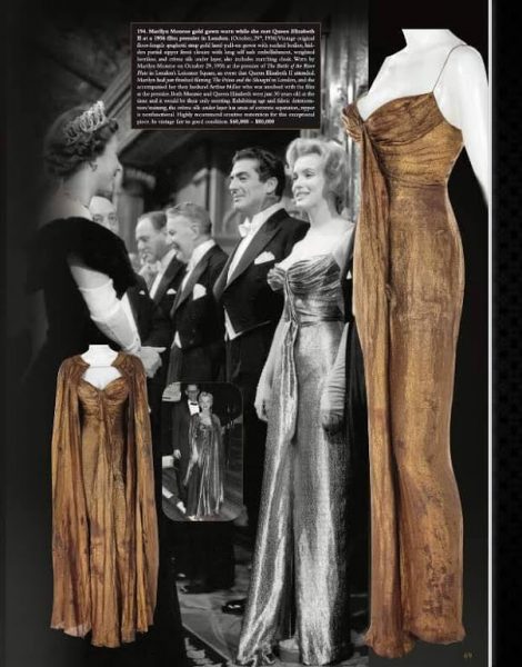 The gold lamé gown and cape worn by Marilyn when she was presented to Queen Elizabeth II at a royal screening of The Battle of River Plate in London’s Empire Theatre in 1956 will go under the hammer at Profiles in History’s Icons & Legends 120 sale on November 12-13, with an estimate of $60,000-$80,00. (You can read more about the famous meeting here.)