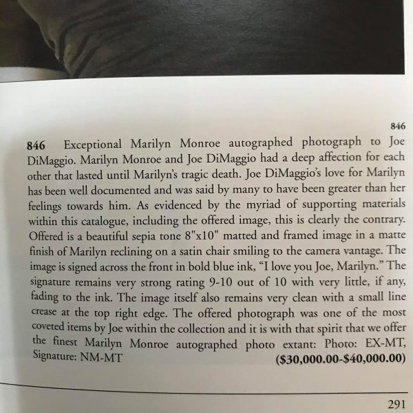 But as Fraser Penney reminds me, there is one exception that proves the rule: this photo from DiMaggio’s estate, inscribed ‘I love you Joe, Marilyn,’ was sold in the Joe DiMaggio Collection sale at Hunt Auctions in 2006.