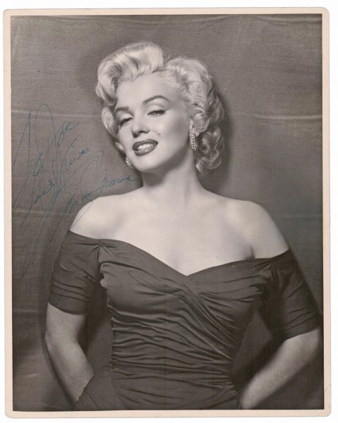 An 11 x 14-inch classic publicity shot of MM, inscribed ‘To Joe, Love + Kisses, Marilyn Monroe,’ will go under the hammer in a University Archives auction on November 11, with an estimate of $20-25K. While the handwriting does appear to Marilyn’s, speculation that it was inscribed to husband Joe DiMaggio seems premature. Given the rather generic message, and the fact that Joe was a very popular name in the 1950s, it is more likely to have been addressed to a colleague or fan; and the print itself resembles those produced by Hollywood studios for the purpose of signing autographs. There is no reason to conclude that it was meant for DiMaggio, but this may not deter buyers as a piece of card also inscribed ‘To Joe’ with an identical message was sold for $1,875 at Heritage Auctions in 2019.