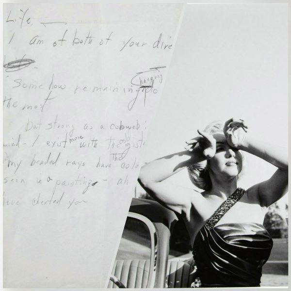 “A single sheet of Arthur Miller’s personalized stationery with a poem penciled on the verso in Marilyn Monroe’s hand. Seemingly about herself, the piece reads in full ‘Life/ I am of both of your directions/ Some how remaining hanging downward/ the most/ but strong as a cobweb in the/ wind exist more with the cold glistening frost/ my beaded rays have the colors I’ve/ seen in a painting – ah life they/ have cheated you.’ This is a melancholy little piece giving us a small insight into the star.”