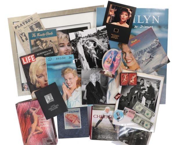 This remarkable collection of Monroe memorabilia – with 225 items including the Douglas Airview brochure which gave Norma Jeane her first formal layout; her debut magazine cover story (Family Circle, 1945); and a book from Marilyn’s personal library (Six O’Clock Casual by Henry W. Cune, 1960), will go under the hammer as part of the Hollywood 118 auction at Profiles in History next Friday (December 18.) Among the other lots is a set of 37 photos of Marilyn; a photo taken with husband Joe DiMaggio, from his estate; an Elois Jenssen costume sketch for Lucille Ball’s TV skit as MM; an oversize candid of Marilyn and Clark Gable in The Misfits; and a poster for the Rolling Stones album, Some Girls (1978), with artwork featuring Marilyn among other Hollywood icons.