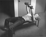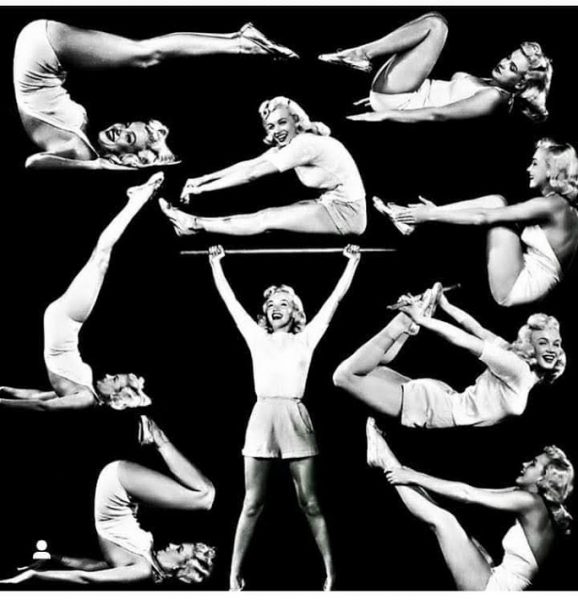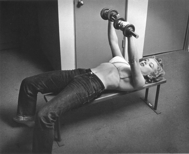 This photo was taken by Edward Cronenwerth in 1948, during Marilyn’s brief stint at Columbia, as part of a promotional shoot for Ladies of the Chorus in which she demonstrated various yoga and pilates positions. Fame was still a few years away, but the young Marilyn worked hard to stay in shape. Perhaps the most famous image of this kind was captured by another photographer – Philippe Halsman – in 1952, as the athletic starlet lifted weights.