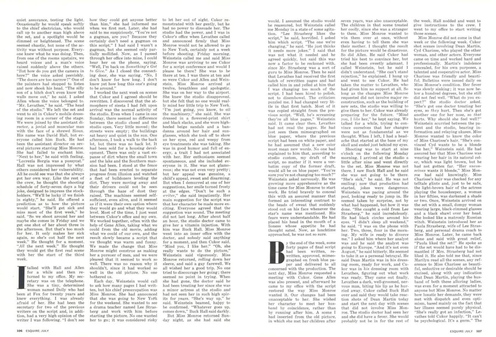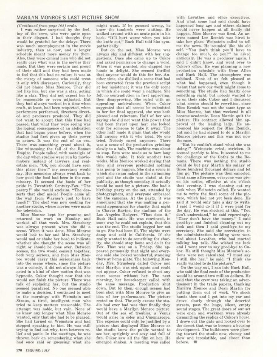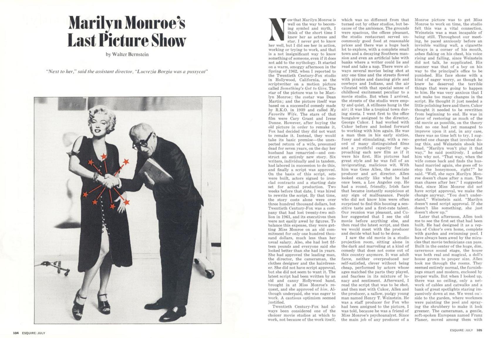 “Cukor instructed him to rewrite entirely his predecessor’s script, but in stark contrast to Cukor’s directive producer Henry Weinstein told Bernstein not to make many changes to the script but just do ‘a little polishing here and there’ … Bernstein then suggested that, since the actress did not have script approval, they should press ahead with the changes anyway. It was a fruitless suggestion. ‘You don’t understand,’ Weinstein retorted. ‘Marilyn doesn’t need script approval. If she doesn’t like something, she just doesn’t show up.'”