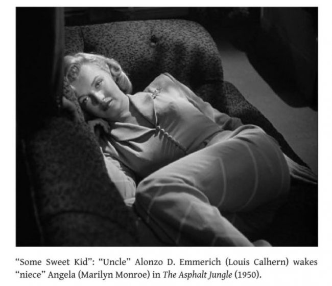 Inside, ‘The Asphalt Jungle: The City Under the City’ heads up a section on heist movies. The big steal is financed by Emmerich (Louis Calhern), a lawyer whose “lush life” and mistress Angela Phinlay (MM) have bankrupted him, in an ironic commentary on “the abject corruption of the ‘haves.'” After meeting with his accomplices, Emmerich shows them out and goes into the living, where Angela – “a curvaceous young woman with blonde hair” – is fast asleep. Miklitsch compares this introduction to Marilyn with a scene from another film noir, Criss Cross (1949), where Yvonne De Carlo sleeps on a couch while the gang plans their caper.