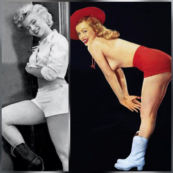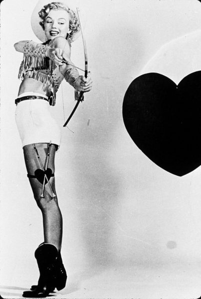 As cowboy boots come back in style, Marie Claire notes that Marilyn was an early adopter, as seen in this Valentine’s Day-themed pin-up from 1951, and other cheesecake shots (sometimes with very little else.)