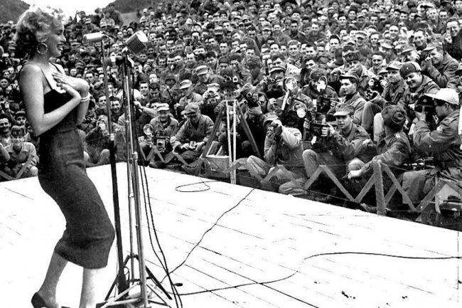 This photo of Marilyn singing for US soldiers in Korea in 1954 illustrates a new Saturday Evening Post article about the United Services Organisation (USO.) Strictly speaking, Marilyn’s visit wasn’t connected to the USO as she arranged it directly with army officers. However, it is commonly referred to as a USO tour and she certainly deserves a place in the history of entertaining the troops. The USO was founded in 1941, just months before America entered World War II, and continues its work to this day.
