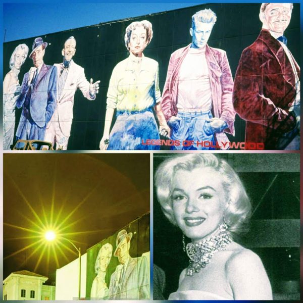 Marilyn is frequently depicted on murals in her hometown of Los Angeles. The sad fate of one of the city’s most famous public artworks at Hudson Avenue on Hollywood Boulevard – in which she was memorably depicted in her ‘Diamonds Are a Girl’s Best Friend’ gown from Gentlemen Prefer Blondes alongside Humphrey Bogart, Fred Astaire, James Dean, Bette Davis and Clark Gable – is revealed by Chris Nichols in LA Magazine.