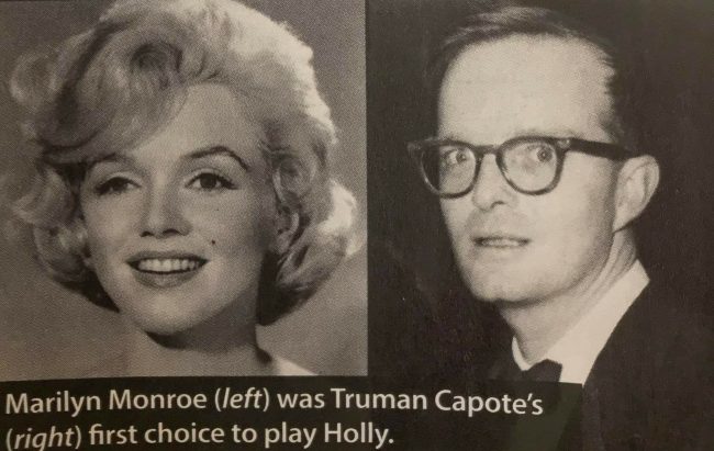 “For him Holly had toughness and fragility and Audrey seemed too wholesome, too perfect,” the article explains, adding that Marilyn’s Actors Studio mentor, Lee Strasberg, vetoed the part, saying, “Marilyn Monroe will not play a call girl, a lady of the evening!” Actually, that quote is usually attributed to Paula Strasberg, and the truth is more complex. In 1960, Marilyn was already committed to The Misfits, and Edward Parone, who worked for her production company, had already advised her that George Axelrod’s screenplay was unworthy of her talents – an opinion that many film critics would later echo (see here.)