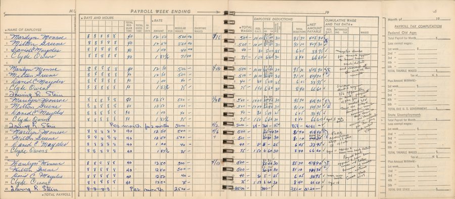 This 1956 payroll book for Marilyn Monroe Productions – with company cheques made out to MM, Milton Greene, and Hedda Rosten – is another highlight.