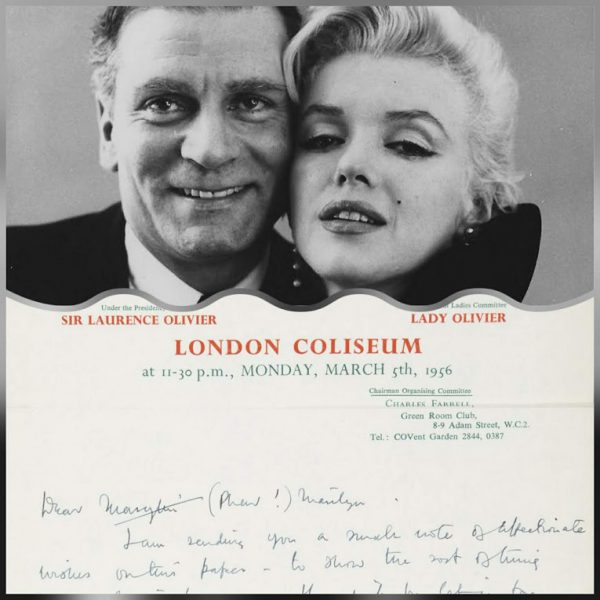 “A handwritten letter sent to Marilyn Monroe from Laurence Olivier, her co-star on the 1957 Warner Bros. film The Prince and the Showgirl. On a single sheet of letterhead noting, in part, ‘The Green Room Cavalcade/ Under the Presidency of/ Sir Laurence Olivier,’ the actor penned his message in blue fountain pen ink on both sides, reading in full, ‘Dear Marylin (Phew!) Marilyn, I am sending you a quick note of affectionate wishes on this paper to show the sort of thing I get let in for. You will be let in for one thing, probably for some food charity over here, but you can rely on me to see it’s a good thing, and nothing you need feel ashamed or foolish about. I am very anxious to get on with The Sleeping Prince [film’s original working title], and hope to God old Milt [Photographer/Producer Milton H. Greene] fixes us up properly soon./ You will be starting Bus Stop any minute now. Give Josh [director Joshua Logan] my love please/ and my very warmest wishes Marilyn, dear, from your Laurence O.’ Olivier further added ‘M.M./ from LO/ M.M.’ on the verso. It is somewhat of a sad letter in hindsight as Monroe scholars know that her collaboration with Olivier did not end well, though it evidently started off hopefully.”