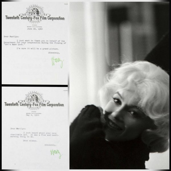 “Two letters from Harry Brand, head of publicity at 20th Century Fox” [sent during production of Let’s Make Love (1960.) In one letter, he commends her for a ‘fine and heartwarming’ charitable act. This may refer to Marilyn’s generosity towards a crew member whose wife was in hospital.]
