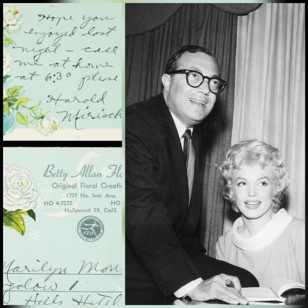 “A handwritten note on a card originally attached to a flower arrangement, sent to Monroe at the Beverly Hills Hotel. The note reads ‘Hope you enjoyed last night – call me at home at 6:30 please?’ Signed Harold Mirisch [producer of Some Like It Hot.]”