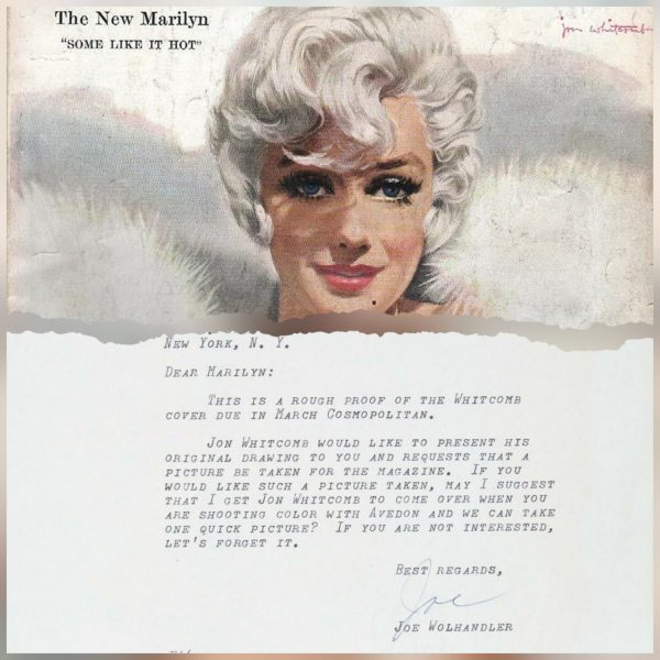 “Letter dated February 9, 1959 and sent to Marilyn Monroe by her publicist, Joe Wolhandler, who in part references her photoshoot with Richard Avedon, and an illustration by Jon Whitcomb for the cover of Cosmopolitan‘s March issue.” Sold separately, “approximately 20 letters, notes, or memos from Wolhandler sent to Marilyn throughout the late 1950s, touching on various topics including Let’s Make Love and Some Like It Hot. Also included are settlement documents from a legal dispute regarding the conflicted end of their professional relationship.”