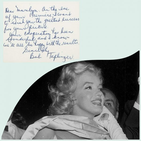 “A handwritten message from publicist Bob Taplinger wishing Monroe luck ‘on the eve of your premiere,’ written on a folded notecard and printed with ‘Robert Spencer Taplinger’ on the cover.” [Taplinger was working at Warner Brothers during the time when Marilyn made The Prince and the Showgirl for the studio.]