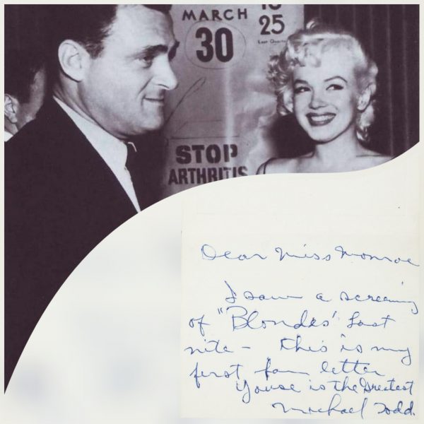“A handwritten message from impresario Michael Todd, reading, ‘I saw a screening of [Gentlemen Prefer] Blondes last nite – this is my first fan letter,’ written on a folded notecard. Interestingly, a message from a member of Monroe’s staff is written on the card as well.” [In 1955, Mike Todd would enlist Marilyn to ride a pink elephant for a charity circus benefit at Madison Square Garden.]