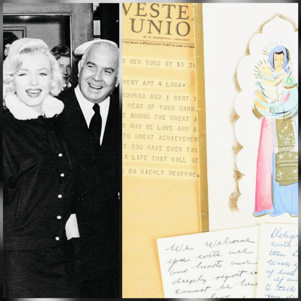 “Four pieces of correspondence from Spyros P. Skouras, president of 20th Century-Fox, including an undated Christmas card, two handwritten notes, and a telegram congratulating Monroe on her 1954 marriage to Joe DiMaggio.” [Marilyn is pictured above with Skouras in the same ensemble she wore to the wedding, but on an earlier occasion. Unless otherwise stated, photos are not included and for illustrative purposes only.]