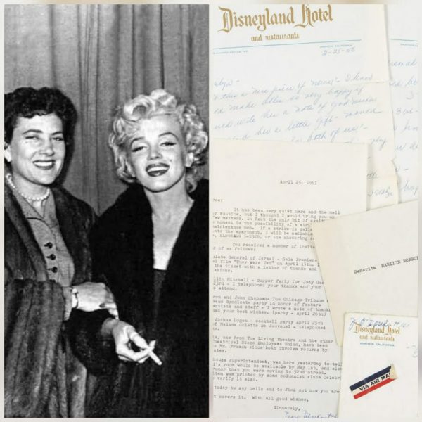 “Three letters regarding various topics. One letter is from Pearl Moskovitz, one of Marilyn’s East Coast secretaries. She writes about various social engagements Marilyn had been invited to, including a supper party for Judy Garland hosted by Jan and Ellin Mitchell on April 23, 1961. Another letter is written entirely in Spanish and sent from Madrid, Spain, with its transmittal envelope. The third is a 1956 letter from Jean O’Doul, pictured above (who had accompanied Marilyn on her famous trip to Korea in 1954) and is penned on Disneyland Hotel letterhead, with its original transmittal envelope.”