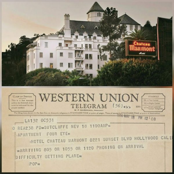 “A telegram from Arthur Miller dated May 18, 1956, reading ‘Arriving 805 or 1055 or 1120. Phoning on arrival. Difficulty getting plane.’ The telegram is signed ‘Pop.'” [Miller was waiting out on his divorce from Mary Slattery in Nevada, and would spend weekends with Marilyn in Hollywood, where she was filming Bus Stop. Although not officially resident at the Chateau Marmont, she often spent time there in the suite of her acting coach, Paula Strasberg.]