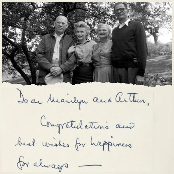 “A handwritten note on the back of a postcard mailed to Marilyn and her third husband from Arthur Millers’ parents, dated June 30, 1956 (one day after their civil ceremony marriage), reading ‘Dear Marilyn and Arthur, Congratulations and best wishes for happiness for always. Love, Helen and Isidore,’ together with the original transmittal envelope, which is missing about 75 percent of its paper.” [Arthur’s mother was christened Augusta – perhaps Helen was a preferred or middle name.]