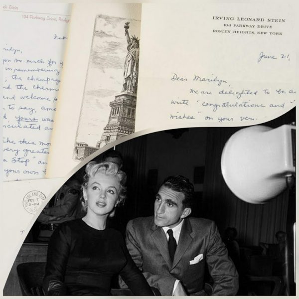 “Two letters and a holiday card from Irving Stein, attorney for Marilyn Monroe Productions, and his wife Charlotte. In one letter, the Steins thank Monroe for a bottle of champagne she sent on their anniversary.”