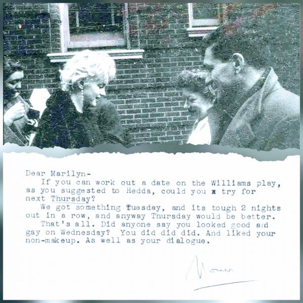“An undated, one-page typed letter to Monroe from poet and friend Norman Rosten. The letter reads, in part, ‘Did anyone say you looked good and gay on Wednesday? You did did did. And liked your non-makeup. As well as your dialogue.’ The letter is signed ‘Norm.'” And sold separately, “a Marilyn Monroe Productions, Inc., business cheque dated March 25, 1960, and signed by Marilyn, and made out to Hedda Rosten in the amount of $65.85.” [Hedda was Norman Rosten’s wife, and worked as a secretary to Marilyn.]