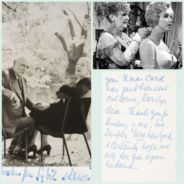 “A handwritten Christmas greeting, undated, from Dame Sybil Thorndike, who costarred with Marilyn in The Prince and the Showgirl.” [Along with cinematographer Jack Cardiff, Dame Sybil was one of the few on the set who got along well with Marilyn – in marked contrast to her director/co-star, Laurence Olivier, with whom she fell out badly.]