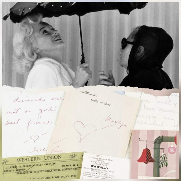 “A group of seven pieces sent by Paula Strasberg to Marilyn: three handwritten short notes, one transmittal envelope, a small Western Union Telefax, a holiday card, and a menu from the ice cream parlor Wil Wright.”