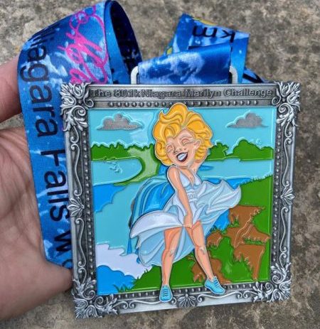 Registration remains open – at niagarafallsmarathon.com – and the 80.1 kilometres must be completed by April 30. Participants can compare their times to an online results board and everyone will receive a medal featuring an image of Marilyn in running shoes and a runner’s bib.