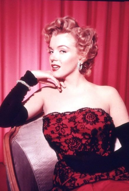 “I have another evening gown which women criticise, but which has won me an appreciable number of comments from men,” Marilyn told Modern Screen in July. “It is a strapless red silk taffeta, snug from the bodice down to the hips, which is covered in black French lace. At I. Magnin’s, where I paid a still price for it, I was told that the dress was the only copy of an original purchased by a San Francisco social leader. I wonder if her dress has ever been criticised in her set the way mine was the night I wore it to one of the few formal Hollywood parties I have attended … it was the proof positive, they claimed, that I was utterly lacking in taste. I’m truly sorry, but I love that dress.”