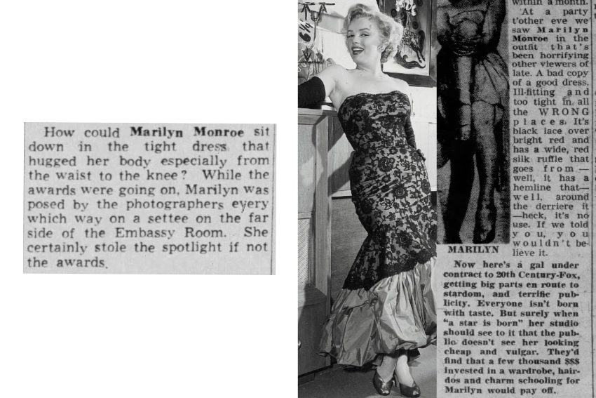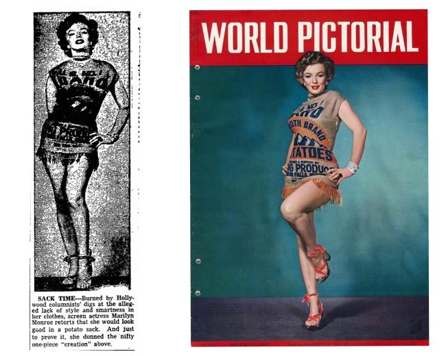 As for who tailored it to hug her famous curves, chances are good it was William Travilla … One of the sack-dress photos ran in Stare, a cheesecake magazine, in 1952 — a year before Playboy launched with Monroe on the cover. ‘MMMarilyn MMMonroe doesn’t care too much for potatoes because it tends to put on weight,’ the Stare caption read. ‘But she decided to do something for the potatoes!'”