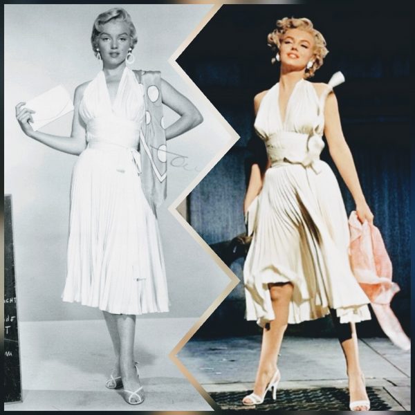 As her star continued to rise, Marilyn wore a daring halter dress to the 1952 Miss America pageant. In February 1953, she sported a revealing gold lamé gown to the Photoplay Awards, and scandalised Joan Crawford. (Both were designed, like the ‘subway dress’, by Travilla.) And in June, she wore a white halter dress while signing her name in cement outside Grauman’s Chinese Theatre.