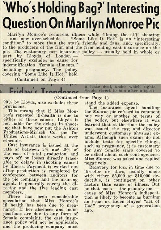 At one point in November of that year, the production headaches grew so pronounced that Variety commissioned a more deeply reported piece that looked at the insurance issues that Monroe’s health problems were causing. In an article entitled ‘Who’s Holding Bag? Interesting Question on Marilyn Monroe Pic,’ the trade noted that productions that blow past their wrap dates weren’t indemnified for ‘female ailments, including pregnancy,’ which the article went on to imply was the cause of her missed days.
