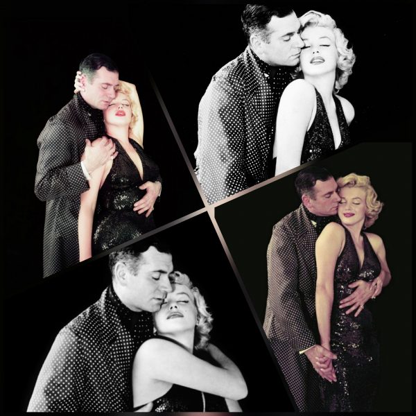 Although The Prince and the Showgirl was a period piece, Warner Brothers requested that the photo session be in modern dress. Marilyn wore a beaded, halter-neck gown by Norman Norell. “I had to fly to London and accompany a very reluctant Larry to New York,” publicist Charles ‘Jerry’ Juroe wrote in his memoir (see here.) “We left the hotel to go to Greene’s studio where Olivier put on his costume, a polka-dotted silk robe. Madame arrived and after the briefest of greetings the session started. Two rolls of film later – only some twenty shots – our diva said, ‘That’s it!’ and left. As the saying goes, that was that!”
