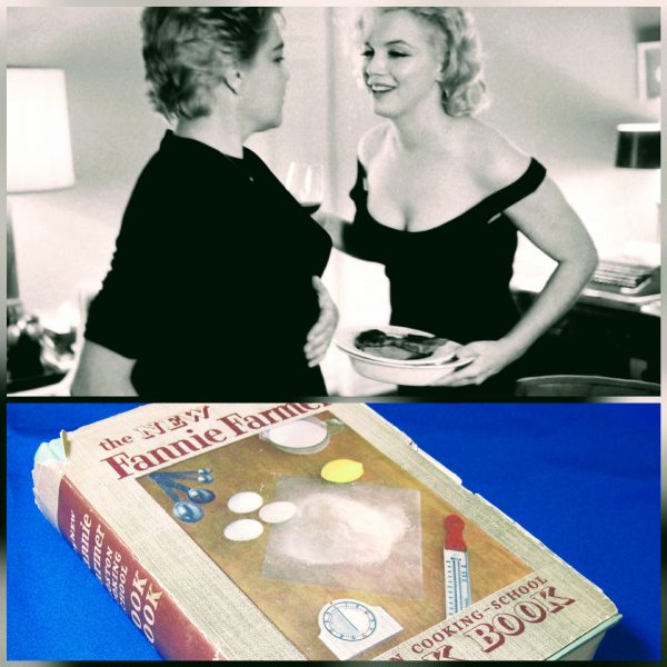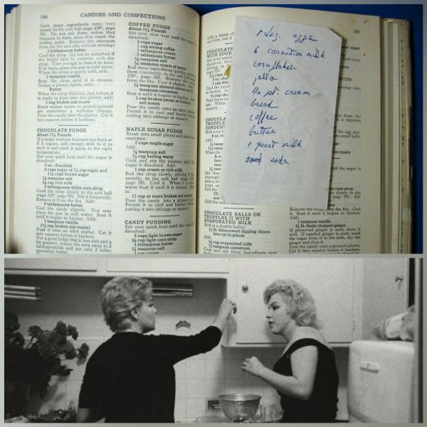 “The New Fannie Farmer Boston Cooking-School Cook Book, published by Little, Brown & Co. and copyright 1951, original cloth, with dust jacket (worn edges). Nestled at page 254 is a recipe for Avery Island French dressing with illustration of a bottle of Tabasco sauce. At page 342 there are two pieces of paper with notes in Marilyn’s hand listing menu for Beef Bourguignon, corned beef and cabbage, and marrow bone soup. The second piece of paper has a short shopping list — 6 or 8 marrow bones for soup, plus bouillon cubes. Page 694 has a blank Thank You card with pencil around the ‘Thank You’, this was used as a book marker for a cake recipe. Page 696 has a hand-written grocery list for rib roast, tomatoes, tomatoes, milk, cream and coffee. A few pages have small stains from cooking — no doubt the cookbook was kept close to the stove as she cooked these elaborate meals.