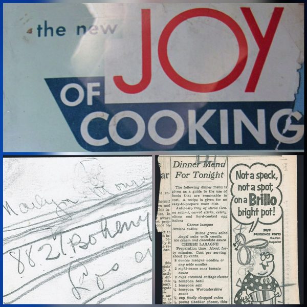 “The two 1950s hardbacks — The New Fannie Farmer Boston Cooking-School Cook Book and The New Joy of Cooking — are the only cookbooks confirmed to have been owned by the archetypical blonde bombshell. The books offer a glimpse into her culinary life, and include handwritten notes with a grocery list, a deli business card with a Beverly Hills-area address written in her handwriting on the back, and a diet schedule. The 20th-century grocery list includes eggs, milk, cornflakes, jello, cream, bread, coffee, butter, and soda. The lot also includes a recipe for cheese lasagna clipped from a newspaper, with doodles.